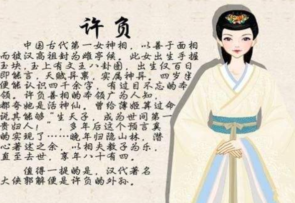 古代第一女神相就是許負,據說(shuō)她的預言非常靈驗,從嬰孩時(shí)就曾有過(guò)預言,并且從未有過(guò)落空,據說(shuō)她出生時(shí)就曾有過(guò)預兆,據說(shuō)始皇二十六年時(shí),秦將王翦的兒子王賁滅燕破齊,天下歸一于秦,始皇帝大喜,令各地官吏上報祥瑞之事,同年秋天時(shí),溫城縣令許望之妻趙氏生下一女,此女出生時(shí)手握玉塊,其上隱隱有文王八卦圖,百日能言,十分神異。